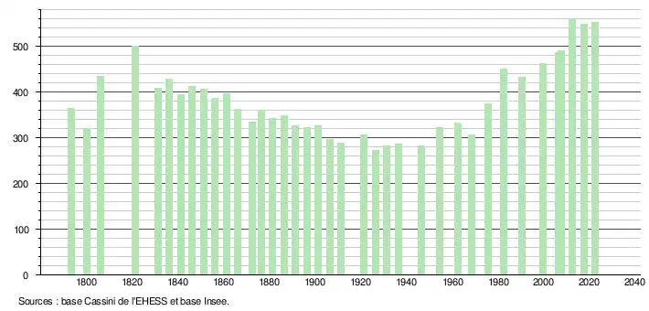 L'évolution du nombre d'habitants est connue à travers les recensements de la population effectués dans la commune depuis 1793. Pour les communes de moins de 10 000 habitants, une enquête de recensement portant sur toute la population est réalisée tous les cinq ans, les populations de référence des années intermédiaires étant quant à elles estimées par interpolation ou extrapolation[27]. Pour la commune, le premier recensement exhaustif entrant dans le cadre du nouveau dispositif a été réalisé en 2007[28].