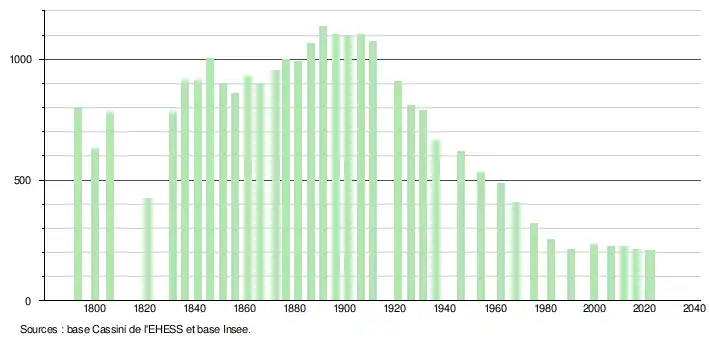 On peut noter une nette décroissance de la population au recensement de 1836 (-55 %), conséquences de la Révolution française et des guerres napoléoniennes ? La population croit régulièrement jusqu’au début du XXe siècle ; puis la révolution industrielle engendre un exode rural qui fait chuter la population de près de 80 % entre 1910 et la fin des années 1980.