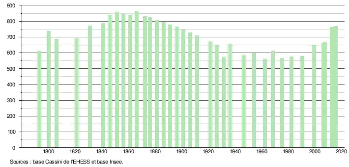 L'évolution du nombre d'habitants est connue à travers les recensements de la population effectués dans la commune depuis 1793. Pour les communes de moins de 10 000 habitants, une enquête de recensement portant sur toute la population est réalisée tous les cinq ans, les populations de référence des années intermédiaires étant quant à elles estimées par interpolation ou extrapolation[13]. Pour la commune, le premier recensement exhaustif entrant dans le cadre du nouveau dispositif a été réalisé en 2007[14].