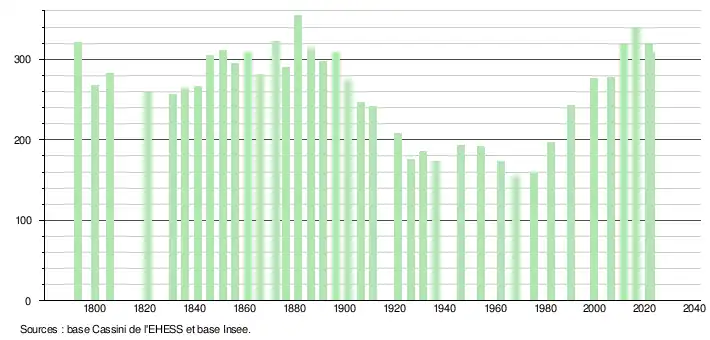 L'évolution du nombre d'habitants est connue à travers les recensements de la population effectués dans la commune depuis 1793. Pour les communes de moins de 10 000 habitants, une enquête de recensement portant sur toute la population est réalisée tous les cinq ans, les populations de référence des années intermédiaires étant quant à elles estimées par interpolation ou extrapolation[16]. Pour la commune, le premier recensement exhaustif entrant dans le cadre du nouveau dispositif a été réalisé en 2006[17].