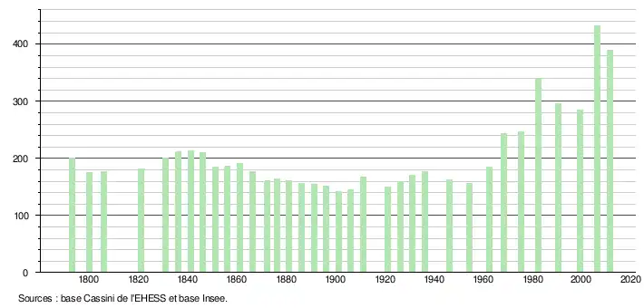 - ↑ Par convention dans Wikipédia, le principe a été retenu de n’afficher dans le tableau des recensements et le graphique, pour les populations légales postérieures à 1999, que les populations correspondant à une enquête exhaustive de recensement pour les communes de moins de 10 000 habitants, et que les populations des années 2006, 2011, 2016, etc. pour les communes de plus de 10 000 habitants, ainsi que la dernière population légale publiée par l’Insee pour l'ensemble des communes.