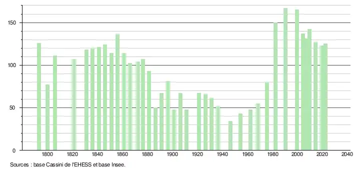 L'évolution du nombre d'habitants est connue à travers les recensements de la population effectués dans la commune depuis 1793. Pour les communes de moins de 10 000 habitants, une enquête de recensement portant sur toute la population est réalisée tous les cinq ans, les populations de référence des années intermédiaires étant quant à elles estimées par interpolation ou extrapolation[14]. Pour la commune, le premier recensement exhaustif entrant dans le cadre du nouveau dispositif a été réalisé en 2004[15].