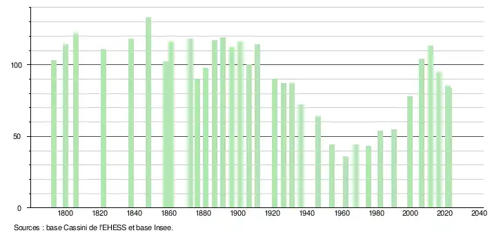 L'évolution du nombre d'habitants est connue à travers les recensements de la population effectués dans la commune depuis 1793. Pour les communes de moins de 10 000 habitants, une enquête de recensement portant sur toute la population est réalisée tous les cinq ans, les populations de référence des années intermédiaires étant quant à elles estimées par interpolation ou extrapolation[19]. Pour la commune, le premier recensement exhaustif entrant dans le cadre du nouveau dispositif a été réalisé en 2006[20].