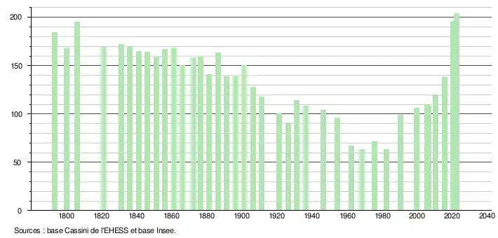L'évolution du nombre d'habitants est connue à travers les recensements de la population effectués dans la commune depuis 1793. Pour les communes de moins de 10 000 habitants, une enquête de recensement portant sur toute la population est réalisée tous les cinq ans, les populations de référence des années intermédiaires étant quant à elles estimées par interpolation ou extrapolation[20]. Pour la commune, le premier recensement exhaustif entrant dans le cadre du nouveau dispositif a été réalisé en 2005[21].