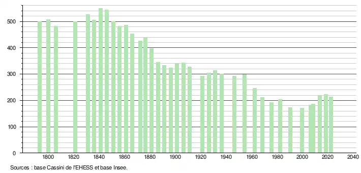 L'évolution du nombre d'habitants est connue à travers les recensements de la population effectués dans la commune depuis 1793. Pour les communes de moins de 10 000 habitants, une enquête de recensement portant sur toute la population est réalisée tous les cinq ans, les populations de référence des années intermédiaires étant quant à elles estimées par interpolation ou extrapolation[24]. Pour la commune, le premier recensement exhaustif entrant dans le cadre du nouveau dispositif a été réalisé en 2008[25].
