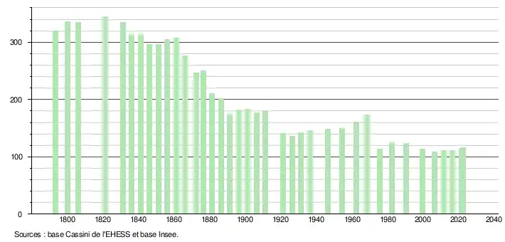 L'évolution du nombre d'habitants est connue à travers les recensements de la population effectués dans la commune depuis 1793. Pour les communes de moins de 10 000 habitants, une enquête de recensement portant sur toute la population est réalisée tous les cinq ans, les populations de référence des années intermédiaires étant quant à elles estimées par interpolation ou extrapolation[33]. Pour la commune, le premier recensement exhaustif entrant dans le cadre du nouveau dispositif a été réalisé en 2006[34].