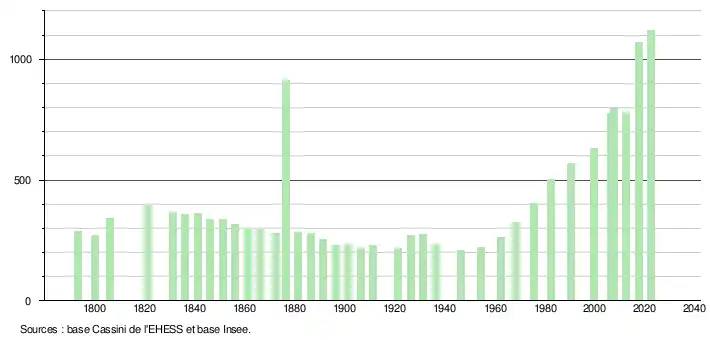 L'évolution du nombre d'habitants est connue à travers les recensements de la population effectués dans la commune depuis 1793. Pour les communes de moins de 10 000 habitants, une enquête de recensement portant sur toute la population est réalisée tous les cinq ans, les populations de référence des années intermédiaires étant quant à elles estimées par interpolation ou extrapolation[23]. Pour la commune, le premier recensement exhaustif entrant dans le cadre du nouveau dispositif a été réalisé en 2007[24].