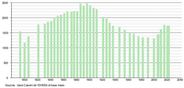 L'évolution du nombre d'habitants est connue à travers les recensements de la population effectués dans la commune depuis 1793. Pour les communes de moins de 10 000 habitants, une enquête de recensement portant sur toute la population est réalisée tous les cinq ans, les populations de référence des années intermédiaires étant quant à elles estimées par interpolation ou extrapolation[16]. Pour la commune, le premier recensement exhaustif entrant dans le cadre du nouveau dispositif a été réalisé en 2005[17].