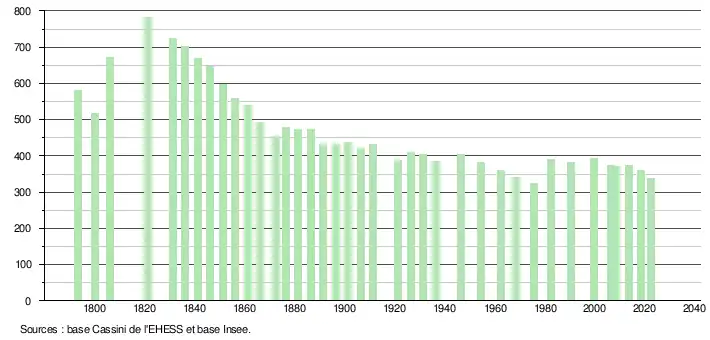 L'évolution du nombre d'habitants est connue à travers les recensements de la population effectués dans la commune depuis 1793. Pour les communes de moins de 10 000 habitants, une enquête de recensement portant sur toute la population est réalisée tous les cinq ans, les populations de référence des années intermédiaires étant quant à elles estimées par interpolation ou extrapolation[28]. Pour la commune, le premier recensement exhaustif entrant dans le cadre du nouveau dispositif a été réalisé en 2008[29].