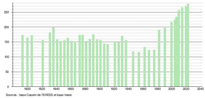 L'évolution du nombre d'habitants est connue à travers les recensements de la population effectués dans la commune depuis 1793. Pour les communes de moins de 10 000 habitants, une enquête de recensement portant sur toute la population est réalisée tous les cinq ans, les populations de référence des années intermédiaires étant quant à elles estimées par interpolation ou extrapolation[32]. Pour la commune, le premier recensement exhaustif entrant dans le cadre du nouveau dispositif a été réalisé en 2004[33].