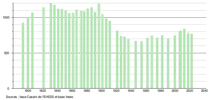 L'évolution du nombre d'habitants est connue à travers les recensements de la population effectués dans la commune depuis 1793. Pour les communes de moins de 10 000 habitants, une enquête de recensement portant sur toute la population est réalisée tous les cinq ans, les populations de référence des années intermédiaires étant quant à elles estimées par interpolation ou extrapolation[30]. Pour la commune, le premier recensement exhaustif entrant dans le cadre du nouveau dispositif a été réalisé en 2007[31].