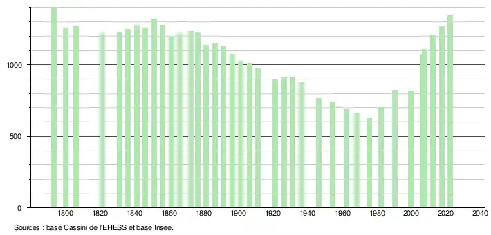 L'évolution du nombre d'habitants est connue à travers les recensements de la population effectués dans la commune depuis 1793. Pour les communes de moins de 10 000 habitants, une enquête de recensement portant sur toute la population est réalisée tous les cinq ans, les populations de référence des années intermédiaires étant quant à elles estimées par interpolation ou extrapolation[18]. Pour la commune, le premier recensement exhaustif entrant dans le cadre du nouveau dispositif a été réalisé en 2007[19].