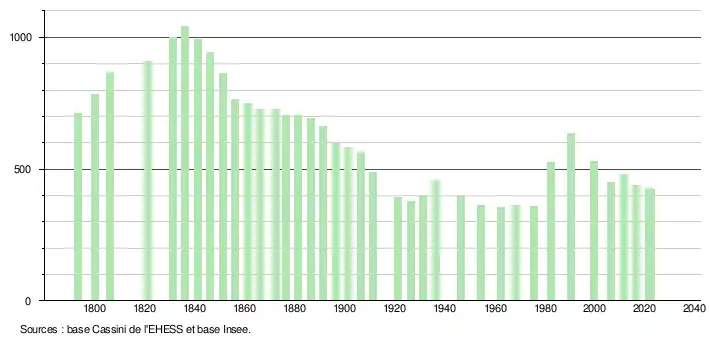 L'évolution du nombre d'habitants est connue à travers les recensements de la population effectués dans la commune depuis 1793. Pour les communes de moins de 10 000 habitants, une enquête de recensement portant sur toute la population est réalisée tous les cinq ans, les populations de référence des années intermédiaires étant quant à elles estimées par interpolation ou extrapolation[19]. Pour la commune, le premier recensement exhaustif entrant dans le cadre du nouveau dispositif a été réalisé en 2006[20].