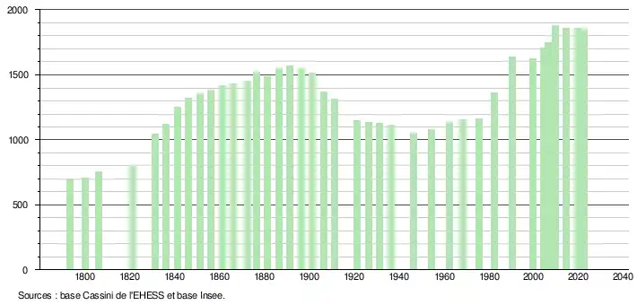 L'évolution du nombre d'habitants est connue à travers les recensements de la population effectués dans la commune depuis 1793. Pour les communes de moins de 10 000 habitants, une enquête de recensement portant sur toute la population est réalisée tous les cinq ans, les populations de référence des années intermédiaires étant quant à elles estimées par interpolation ou extrapolation[14]. Pour la commune, le premier recensement exhaustif entrant dans le cadre du nouveau dispositif a été réalisé en 2004[15].
