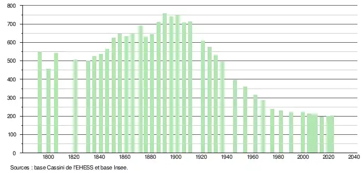 L'évolution du nombre d'habitants est connue à travers les recensements de la population effectués dans la commune depuis 1793. Pour les communes de moins de 10 000 habitants, une enquête de recensement portant sur toute la population est réalisée tous les cinq ans, les populations de référence des années intermédiaires étant quant à elles estimées par interpolation ou extrapolation[21]. Pour la commune, le premier recensement exhaustif entrant dans le cadre du nouveau dispositif a été réalisé en 2004[22].