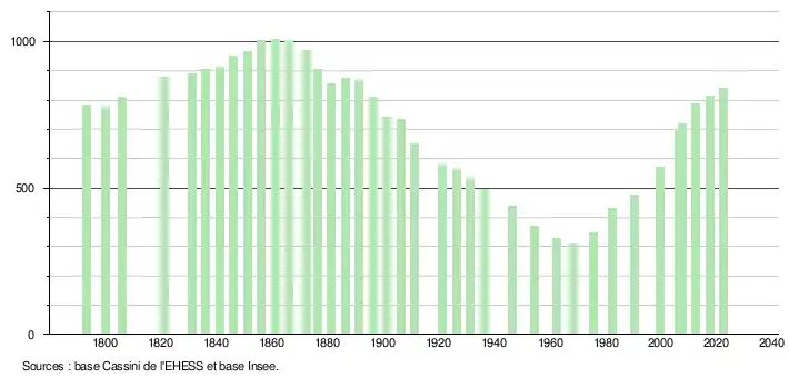 L'évolution du nombre d'habitants est connue à travers les recensements de la population effectués dans la commune depuis 1793. Pour les communes de moins de 10 000 habitants, une enquête de recensement portant sur toute la population est réalisée tous les cinq ans, les populations de référence des années intermédiaires étant quant à elles estimées par interpolation ou extrapolation[15]. Pour la commune, le premier recensement exhaustif entrant dans le cadre du nouveau dispositif a été réalisé en 2007[16].