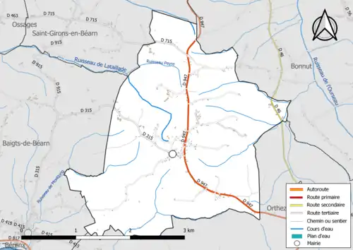 Tous les ruisseaux de la commune y prennent leur source : elle est traversée[8] par un affluent du Luy, le ruisseau du Grand Arrigan (23,5 km), par ceux du bassin versant du gave de Pau, les ruisseaux de Lataillade (13,7 km) (et par ses tributaires, le ruisseau Peyré et le ruisseau Hontarède) et le ruisseau de Monlong, et par ceux du bassin versant du Luy de Béarn, les ruisseaux permanents de Pehitte et du Bosq.