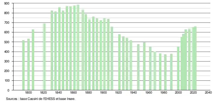 L'évolution du nombre d'habitants est connue à travers les recensements de la population effectués dans la commune depuis 1793. Pour les communes de moins de 10 000 habitants, une enquête de recensement portant sur toute la population est réalisée tous les cinq ans, les populations de référence des années intermédiaires étant quant à elles estimées par interpolation ou extrapolation[18]. Pour la commune, le premier recensement exhaustif entrant dans le cadre du nouveau dispositif a été réalisé en 2004[19].