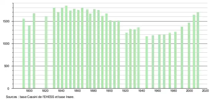 L'évolution du nombre d'habitants est connue à travers les recensements de la population effectués dans la commune depuis 1793. À partir du , les populations légales des communes sont publiées annuellement dans le cadre d'un recensement qui repose désormais sur une collecte d'information annuelle, concernant successivement tous les territoires communaux au cours d'une période de cinq ans. Pour les communes de moins de 10 000 habitants, une enquête de recensement portant sur toute la population est réalisée tous les cinq ans, les populations légales des années intermédiaires étant quant à elles estimées par interpolation ou extrapolation[1]. Pour la commune, le premier recensement exhaustif entrant dans le cadre du nouveau dispositif a été réalisé en 2005[2],[Note 1].