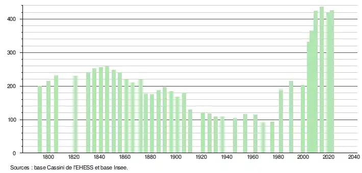 L'évolution du nombre d'habitants est connue à travers les recensements de la population effectués dans la commune depuis 1793. Pour les communes de moins de 10 000 habitants, une enquête de recensement portant sur toute la population est réalisée tous les cinq ans, les populations de référence des années intermédiaires étant quant à elles estimées par interpolation ou extrapolation[30]. Pour la commune, le premier recensement exhaustif entrant dans le cadre du nouveau dispositif a été réalisé en 2004[31].