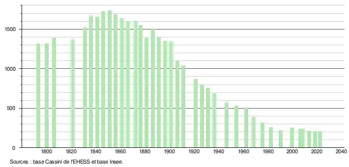 L'évolution du nombre d'habitants est connue à travers les recensements de la population effectués dans la commune depuis 1793. Pour les communes de moins de 10 000 habitants, une enquête de recensement portant sur toute la population est réalisée tous les cinq ans, les populations de référence des années intermédiaires étant quant à elles estimées par interpolation ou extrapolation[18]. Pour la commune, le premier recensement exhaustif entrant dans le cadre du nouveau dispositif a été réalisé en 2008[19].