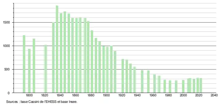 L'évolution du nombre d'habitants est connue à travers les recensements de la population effectués dans la commune depuis 1793. Pour les communes de moins de 10 000 habitants, une enquête de recensement portant sur toute la population est réalisée tous les cinq ans, les populations de référence des années intermédiaires étant quant à elles estimées par interpolation ou extrapolation[12]. Pour la commune, le premier recensement exhaustif entrant dans le cadre du nouveau dispositif a été réalisé en 2008[13].