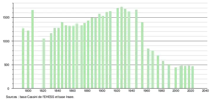 L'évolution du nombre d'habitants est connue à travers les recensements de la population effectués dans la commune depuis 1793. Pour les communes de moins de 10 000 habitants, une enquête de recensement portant sur toute la population est réalisée tous les cinq ans, les populations de référence des années intermédiaires étant quant à elles estimées par interpolation ou extrapolation[38]. Pour la commune, le premier recensement exhaustif entrant dans le cadre du nouveau dispositif a été réalisé en 2007[39].