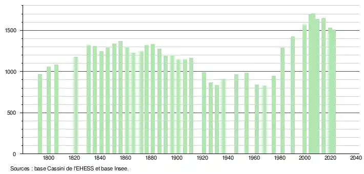 L'évolution du nombre d'habitants est connue à travers les recensements de la population effectués dans la commune depuis 1793. Pour les communes de moins de 10000habitants, une enquête de recensement portant sur toute la population est réalisée tous les cinqans, les populations de référence des années intermédiaires étant quant à elles estimées par interpolation ou extrapolation[21]. Pour la commune, le premier recensement exhaustif entrant dans le cadre du nouveau dispositif a été réalisé en 2004[22].