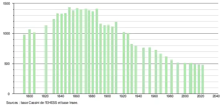 L'évolution du nombre d'habitants est connue à travers les recensements de la population effectués dans la commune depuis 1793. Pour les communes de moins de 10 000 habitants, une enquête de recensement portant sur toute la population est réalisée tous les cinq ans, les populations de référence des années intermédiaires étant quant à elles estimées par interpolation ou extrapolation[26]. Pour la commune, le premier recensement exhaustif entrant dans le cadre du nouveau dispositif a été réalisé en 2007[27].