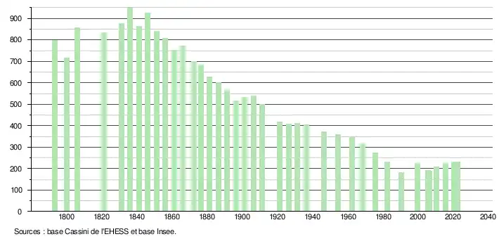 L'évolution du nombre d'habitants est connue à travers les recensements de la population effectués dans la commune depuis 1793. Pour les communes de moins de 10 000 habitants, une enquête de recensement portant sur toute la population est réalisée tous les cinq ans, les populations de référence des années intermédiaires étant quant à elles estimées par interpolation ou extrapolation[15]. Pour la commune, le premier recensement exhaustif entrant dans le cadre du nouveau dispositif a été réalisé en 2005[16].