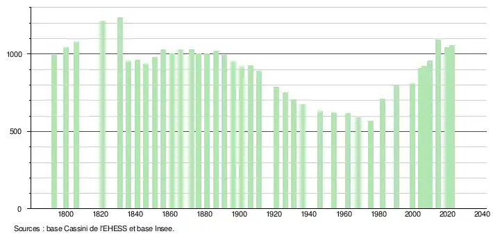 L'évolution du nombre d'habitants est connue à travers les recensements de la population effectués dans la commune depuis 1793. Pour les communes de moins de 10 000 habitants, une enquête de recensement portant sur toute la population est réalisée tous les cinq ans, les populations de référence des années intermédiaires étant quant à elles estimées par interpolation ou extrapolation[16]. Pour la commune, le premier recensement exhaustif entrant dans le cadre du nouveau dispositif a été réalisé en 2004[17].