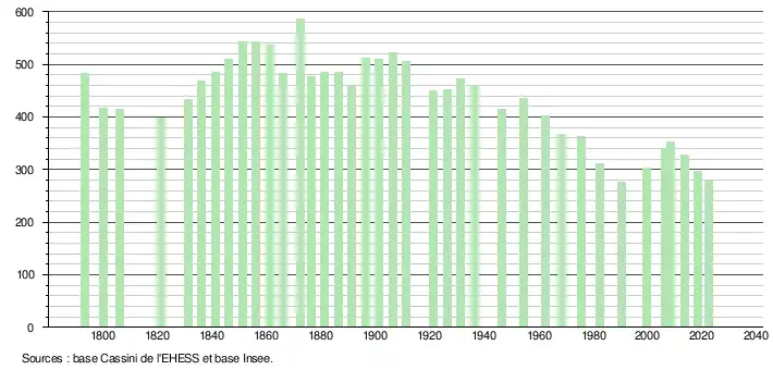 L'évolution du nombre d'habitants est connue à travers les recensements de la population effectués dans la commune depuis 1793. Pour les communes de moins de 10 000 habitants, une enquête de recensement portant sur toute la population est réalisée tous les cinq ans, les populations de référence des années intermédiaires étant quant à elles estimées par interpolation ou extrapolation[19]. Pour la commune, le premier recensement exhaustif entrant dans le cadre du nouveau dispositif a été réalisé en 2008[20].