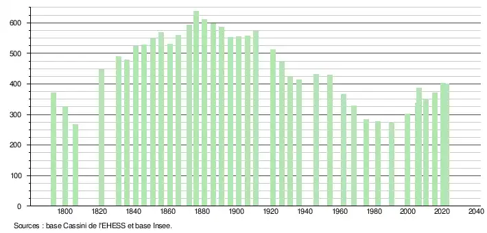 L'évolution du nombre d'habitants est connue à travers les recensements de la population effectués dans la commune depuis 1793. Pour les communes de moins de 10 000 habitants, une enquête de recensement portant sur toute la population est réalisée tous les cinq ans, les populations de référence des années intermédiaires étant quant à elles estimées par interpolation ou extrapolation[20]. Pour la commune, le premier recensement exhaustif entrant dans le cadre du nouveau dispositif a été réalisé en 2005[21].