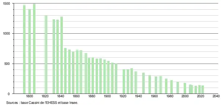 L'évolution du nombre d'habitants est connue à travers les recensements de la population effectués dans la commune depuis 1793. Pour les communes de moins de 10 000 habitants, une enquête de recensement portant sur toute la population est réalisée tous les cinq ans, les populations de référence des années intermédiaires étant quant à elles estimées par interpolation ou extrapolation[14]. Pour la commune, le premier recensement exhaustif entrant dans le cadre du nouveau dispositif a été réalisé en 2008[15].