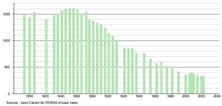L'évolution du nombre d'habitants est connue à travers les recensements de la population effectués dans la commune depuis 1793. Pour les communes de moins de 10 000 habitants, une enquête de recensement portant sur toute la population est réalisée tous les cinq ans, les populations de référence des années intermédiaires étant quant à elles estimées par interpolation ou extrapolation[27]. Pour la commune, le premier recensement exhaustif entrant dans le cadre du nouveau dispositif a été réalisé en 2004[28].