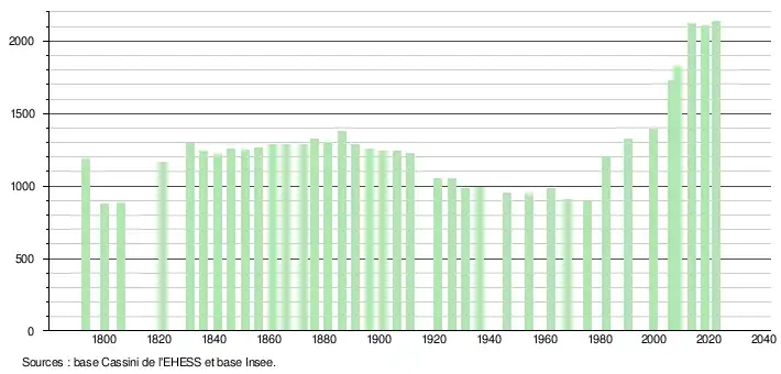 L'évolution du nombre d'habitants est connue à travers les recensements de la population effectués dans la commune depuis 1793. Pour les communes de moins de 10 000 habitants, une enquête de recensement portant sur toute la population est réalisée tous les cinq ans, les populations de référence des années intermédiaires étant quant à elles estimées par interpolation ou extrapolation[26]. Pour la commune, le premier recensement exhaustif entrant dans le cadre du nouveau dispositif a été réalisé en 2008[27].