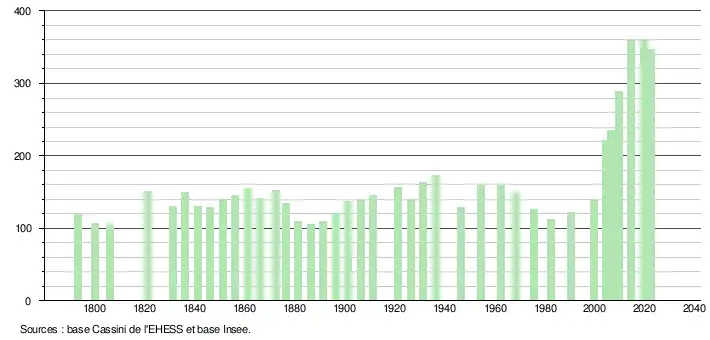 L'évolution du nombre d'habitants est connue à travers les recensements de la population effectués dans la commune depuis 1793. Pour les communes de moins de 10 000 habitants, une enquête de recensement portant sur toute la population est réalisée tous les cinq ans, les populations de référence des années intermédiaires étant quant à elles estimées par interpolation ou extrapolation[17]. Pour la commune, le premier recensement exhaustif entrant dans le cadre du nouveau dispositif a été réalisé en 2004[18].