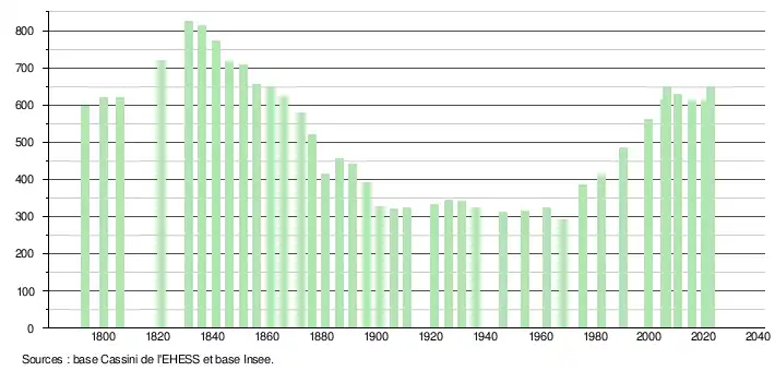 L'évolution du nombre d'habitants est connue à travers les recensements de la population effectués dans la commune depuis 1793. Pour les communes de moins de 10 000 habitants, une enquête de recensement portant sur toute la population est réalisée tous les cinq ans, les populations de référence des années intermédiaires étant quant à elles estimées par interpolation ou extrapolation[22]. Pour la commune, le premier recensement exhaustif entrant dans le cadre du nouveau dispositif a été réalisé en 2005[23].