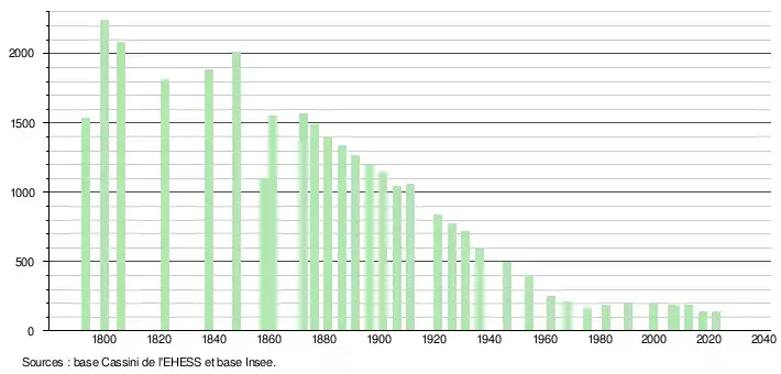 L'évolution du nombre d'habitants est connue à travers les recensements de la population effectués dans la commune depuis 1793. Pour les communes de moins de 10000habitants, une enquête de recensement portant sur toute la population est réalisée tous les cinqans, les populations de référence des années intermédiaires étant quant à elles estimées par interpolation ou extrapolation[18]. Pour la commune, le premier recensement exhaustif entrant dans le cadre du nouveau dispositif a été réalisé en 2007[19].