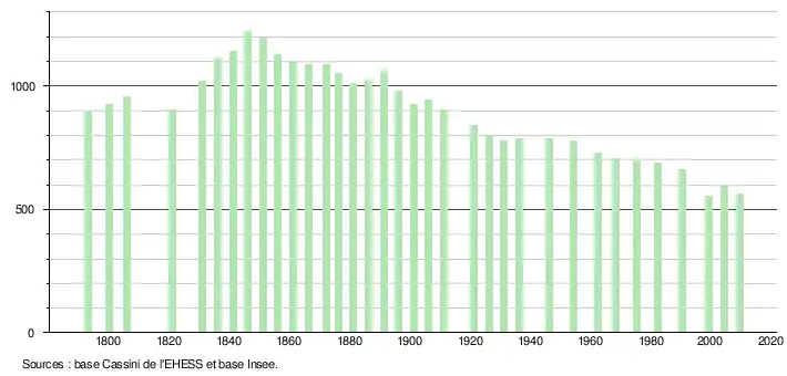 L'évolution du nombre d'habitants est connue à travers les recensements de la population effectués dans la commune depuis 1793. À partir du , les populations légales des communes sont publiées annuellement dans le cadre d'un recensement qui repose désormais sur une collecte d'information annuelle, concernant successivement tous les territoires communaux au cours d'une période de cinq ans. Pour les communes de moins de 10 000 habitants, une enquête de recensement portant sur toute la population est réalisée tous les cinq ans, les populations légales des années intermédiaires étant quant à elles estimées par interpolation ou extrapolation[2]. Pour la commune, le premier recensement exhaustif entrant dans le cadre du nouveau dispositif a été réalisé en 2004[3],[Note 1].