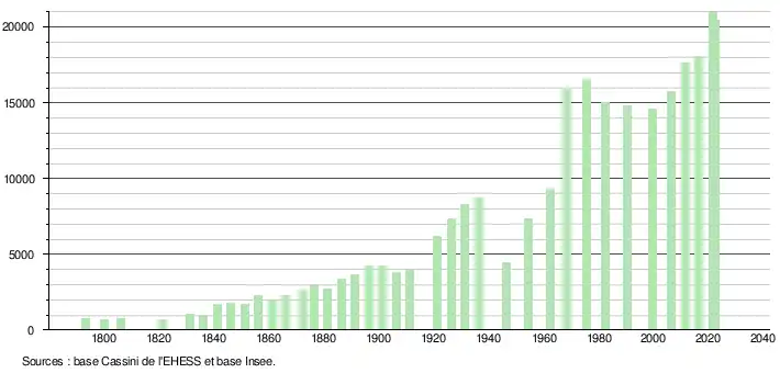 - ↑ Par convention dans Wikipédia, le principe a été retenu de n’afficher dans le tableau des recensements et le graphique, pour les populations de référence postérieures à 1999, que les populations correspondant à une enquête exhaustive de recensement pour les communes de moins de 10 000 habitants, et que les populations des années 2006, 2011, 2016, etc. pour les communes de plus de 10 000 habitants, ainsi que la dernière population de référence publiée par l’Insee pour l'ensemble des communes.