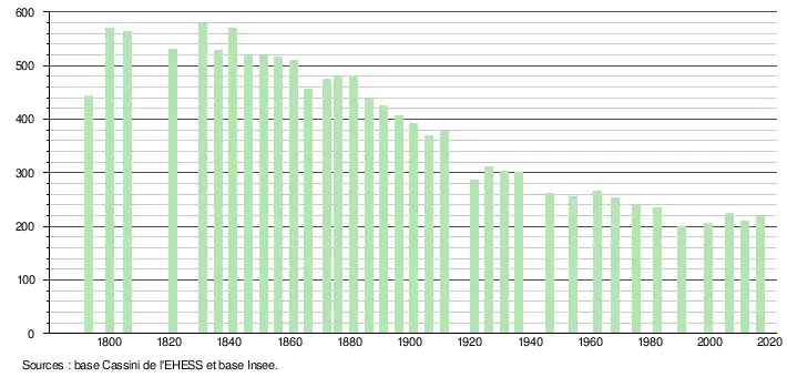 L'évolution du nombre d'habitants est connue à travers les recensements de la population effectués dans la commune depuis 1793. Pour les communes de moins de 10 000 habitants, une enquête de recensement portant sur toute la population est réalisée tous les cinq ans, les populations de référence des années intermédiaires étant quant à elles estimées par interpolation ou extrapolation[6]. Pour la commune, le premier recensement exhaustif entrant dans le cadre du nouveau dispositif a été réalisé en 2006[7].