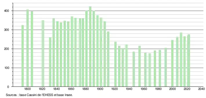 L'évolution du nombre d'habitants est connue à travers les recensements de la population effectués dans la commune depuis 1793. Pour les communes de moins de 10 000 habitants, une enquête de recensement portant sur toute la population est réalisée tous les cinq ans, les populations de référence des années intermédiaires étant quant à elles estimées par interpolation ou extrapolation[15]. Pour la commune, le premier recensement exhaustif entrant dans le cadre du nouveau dispositif a été réalisé en 2006[16].