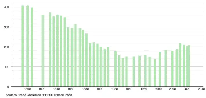 L'évolution du nombre d'habitants est connue à travers les recensements de la population effectués dans la commune depuis 1793. Pour les communes de moins de 10 000 habitants, une enquête de recensement portant sur toute la population est réalisée tous les cinq ans, les populations de référence des années intermédiaires étant quant à elles estimées par interpolation ou extrapolation[18]. Pour la commune, le premier recensement exhaustif entrant dans le cadre du nouveau dispositif a été réalisé en 2005[19].
