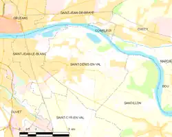 La commune de Saint-Denis-en-Val se trouve dans le quadrant sud-ouest du département du Loiret, dans la région agricole du Val de Loire[3] et l'aire urbaine d'Orléans[4]. À vol d'oiseau, elle se situe à 4,7 km d'Orléans[5], préfecture du département, et à 2,3 km de Saint-Jean-le-Blanc, ancien chef-lieu du canton dont dépendait la commune avant mars 2015. La commune fait partie du bassin de vie d'Orléans[4].
