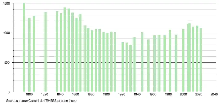 L'évolution du nombre d'habitants est connue à travers les recensements de la population effectués dans la commune depuis 1793. Pour les communes de moins de 10 000 habitants, une enquête de recensement portant sur toute la population est réalisée tous les cinq ans, les populations de référence des années intermédiaires étant quant à elles estimées par interpolation ou extrapolation[22]. Pour la commune, le premier recensement exhaustif entrant dans le cadre du nouveau dispositif a été réalisé en 2007[23].