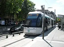 Le tramway T8 peu avant son inauguration, rue Danielle-Casanova, fin 2014.