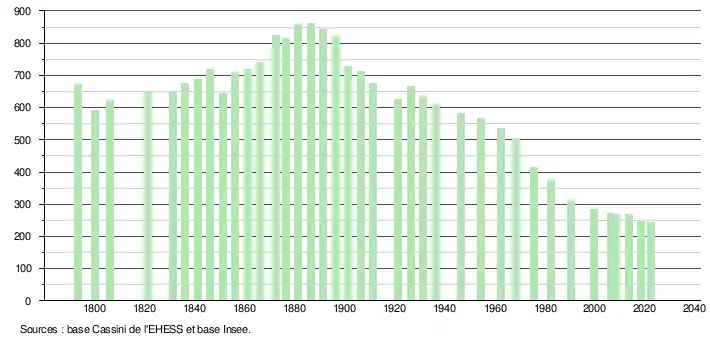 L'évolution du nombre d'habitants est connue à travers les recensements de la population effectués dans la commune depuis 1793. Pour les communes de moins de 10 000 habitants, une enquête de recensement portant sur toute la population est réalisée tous les cinq ans, les populations de référence des années intermédiaires étant quant à elles estimées par interpolation ou extrapolation[16]. Pour la commune, le premier recensement exhaustif entrant dans le cadre du nouveau dispositif a été réalisé en 2008[17].