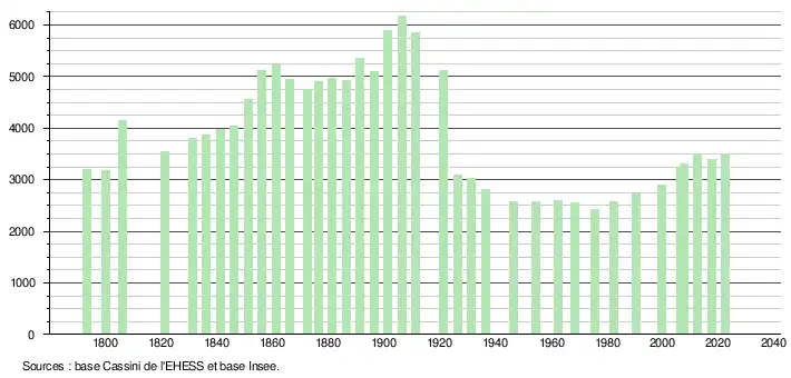 L'évolution du nombre d'habitants est connue à travers les recensements de la population effectués dans la commune depuis 1793. Pour les communes de moins de 10 000 habitants, une enquête de recensement portant sur toute la population est réalisée tous les cinq ans, les populations de référence des années intermédiaires étant quant à elles estimées par interpolation ou extrapolation[39]. Pour la commune, le premier recensement exhaustif entrant dans le cadre du nouveau dispositif a été réalisé en 2007[40].