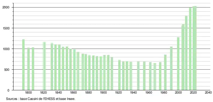 La population était traditionnellement très dispersée. Par exemple, lors du recensement de 1936, pour un total de 682 habitants, la population du bourg ["agglomérée au chef-lieu"] est de 114 habitants et celle des hameaux ["population dispersée"] de 568 habitants[1]. Ce n'est que progressivement depuis les deux dernières décennies du XXe siècle que l'exode rural d'une part, la périurbanisation qui a entraîné la création de nombreux lotissements d'autre part, a modifié la répartition de la population communale, désormais principalement agglomérée.